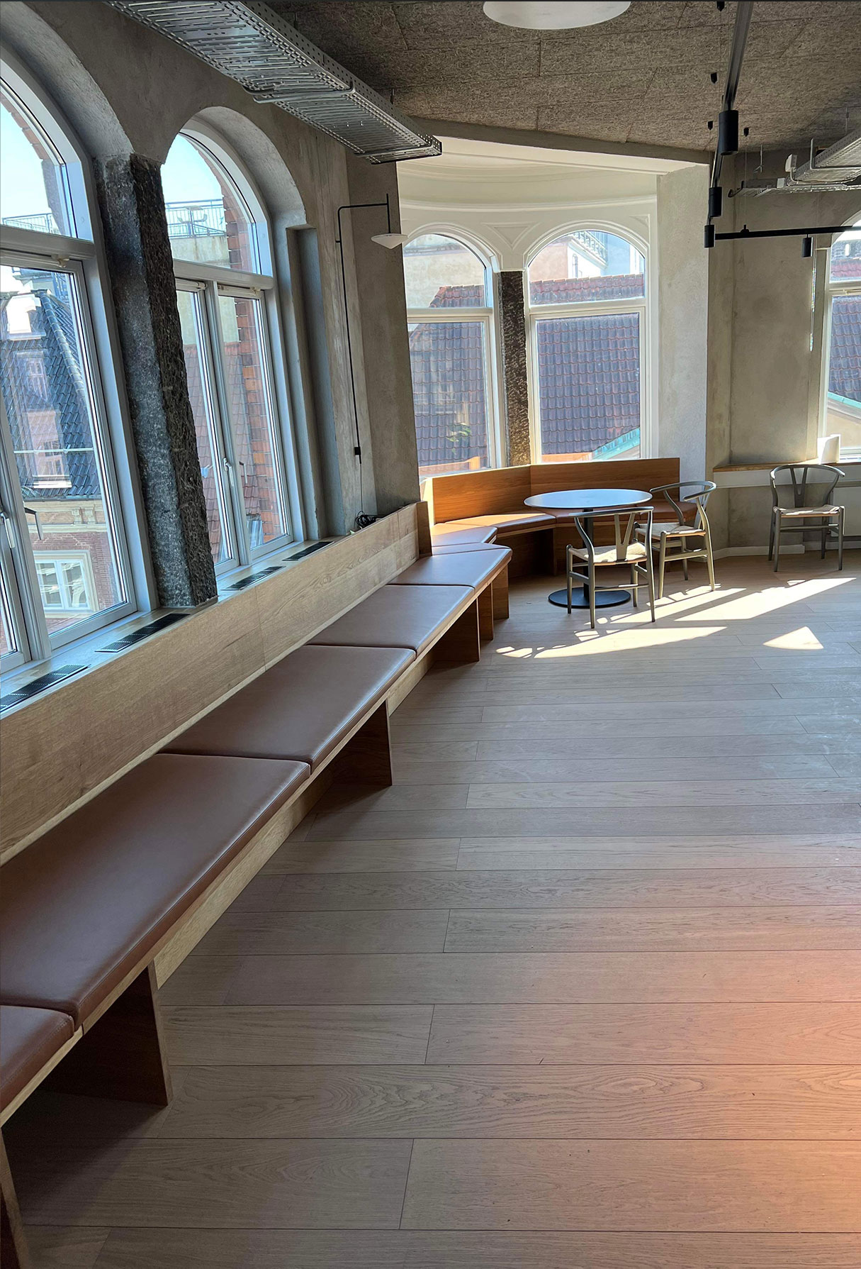 Vi laver mange forskellige erhvervsløsninger. Bl.a. et buffetbord til kantinen de flotte gamle kontorlokaler hos en af vores erhvervskunder. De ønskede en buffet til medarbejderne, som er både smuk at se på og samtidig har praktisk opbevaring til service. Løsningen i massivt egetræ bryder med det ellers industrielle look i lokalerne, og får kantinen til at se indbydende ud, når der kommer kunder eller forretningspartnere på besøg til frokost.